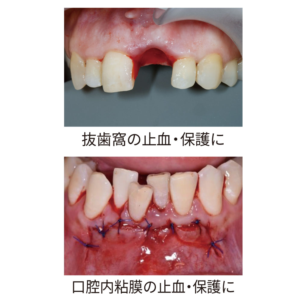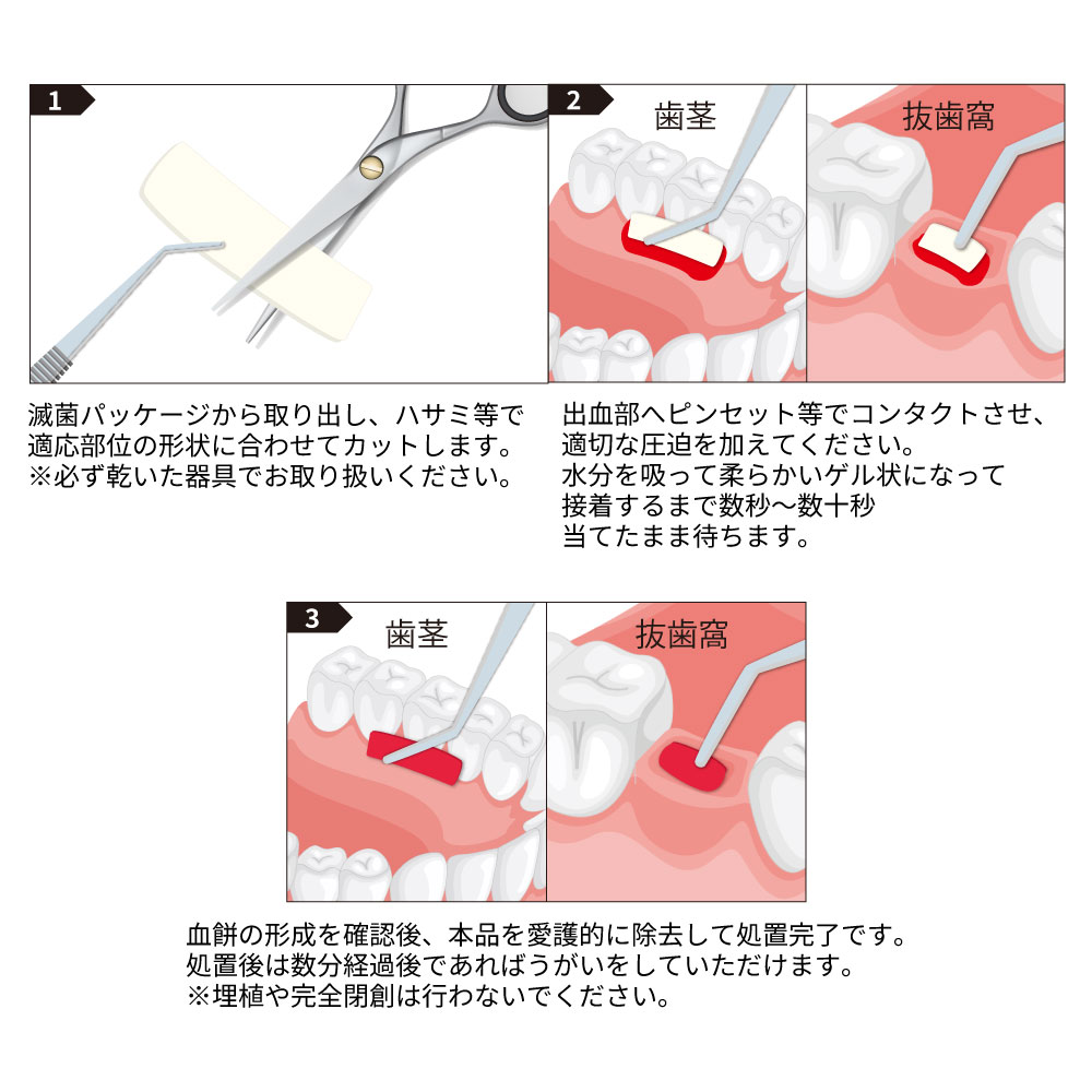 抜歯窩の止血・保護に。口腔内粘膜の止血・保護に。マッシュルームから抽出・精製された植物性キトサン100%で構成された製品で、高い生体適合性と安全性を両立しています。優れた柔軟性と加工性を備えているので、臨床現場の状況や適用部位の形状に合わせて、術者が自在に形態を調整できます。独自の電荷特性(陽電荷)により赤血球と相互作用し、血液を吸うと素早くゲル化して患部に密着します 。