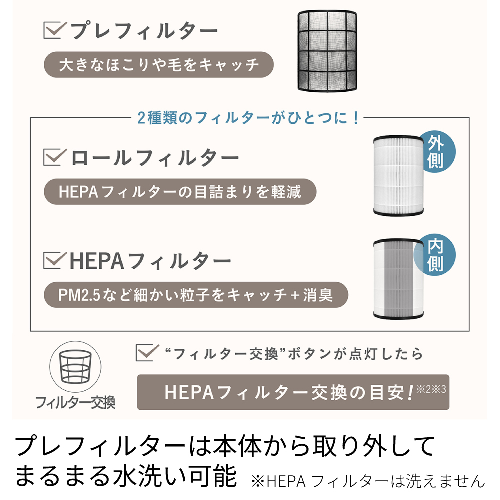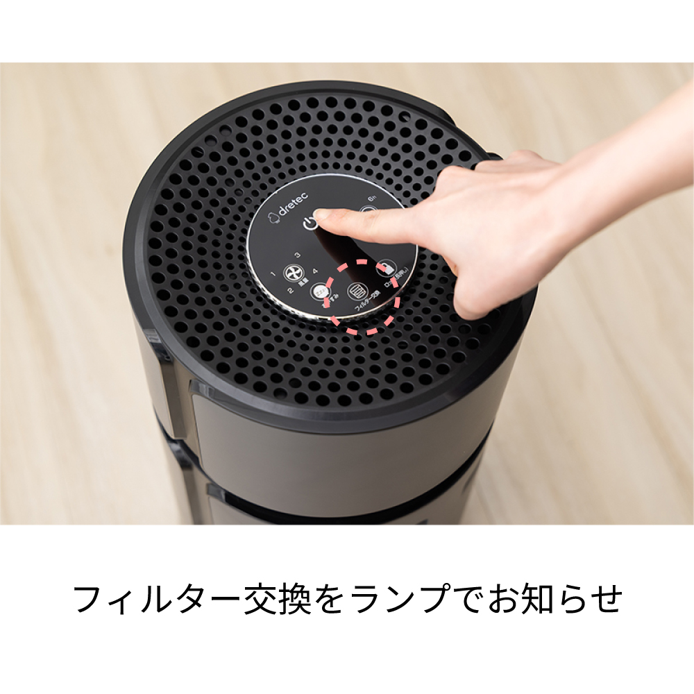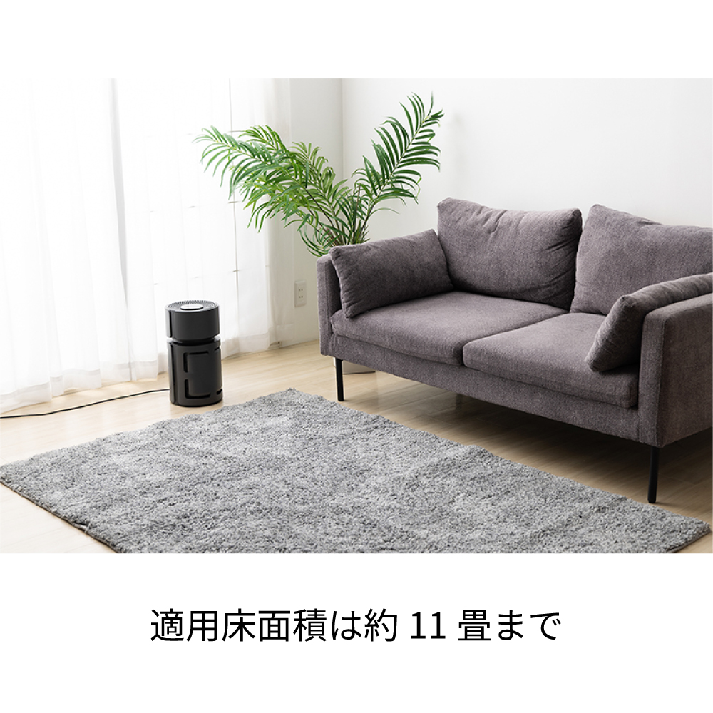 においやペットの毛などを専用フィルターでみんなに優しい空間に。適用床面積:約11畳まで。4段階の風量切り替え。フィルター交換をランプでお知らせ。2・4・6・8時間で設定できる切タイマー。おやすみモード、チャイルドロック搭載。