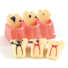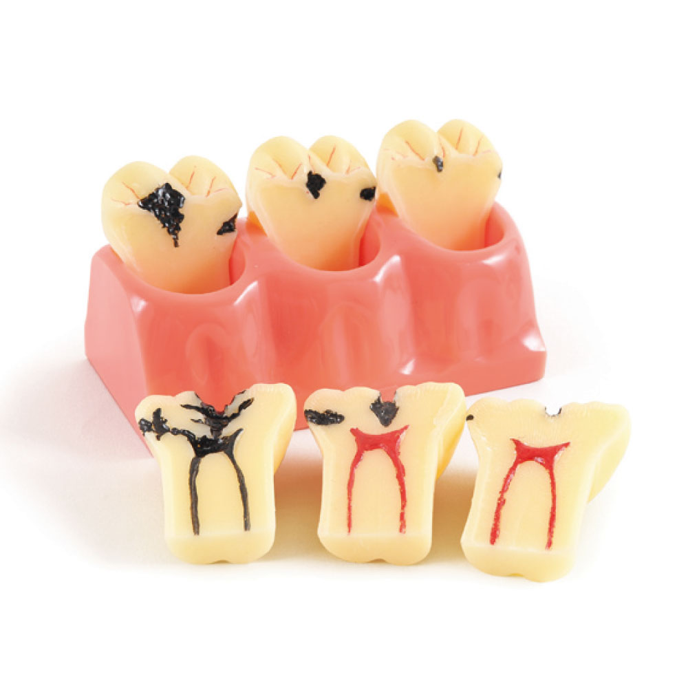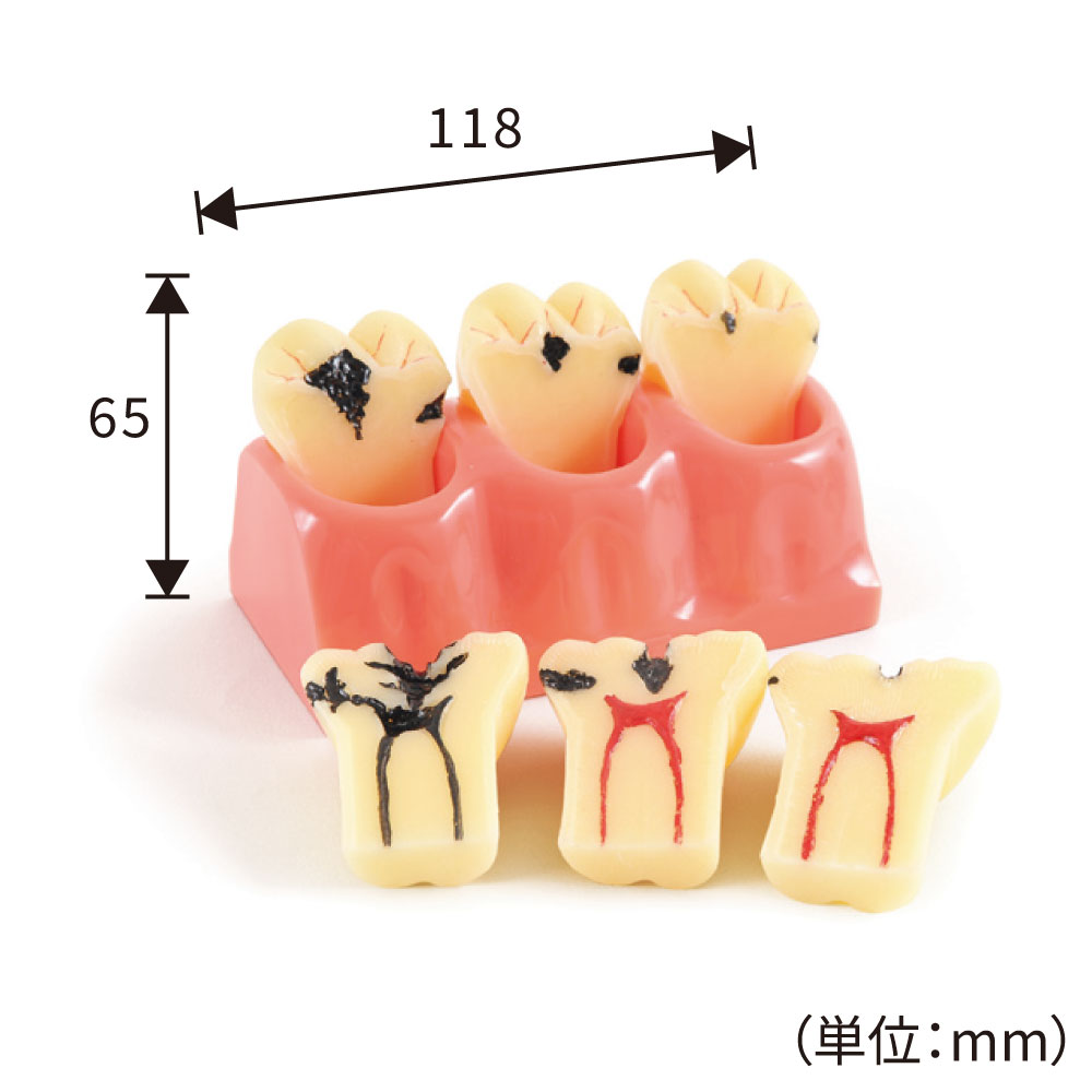 2分割されており、カリエスが歯に与える影響を3段階の順でみることができるモデルです。