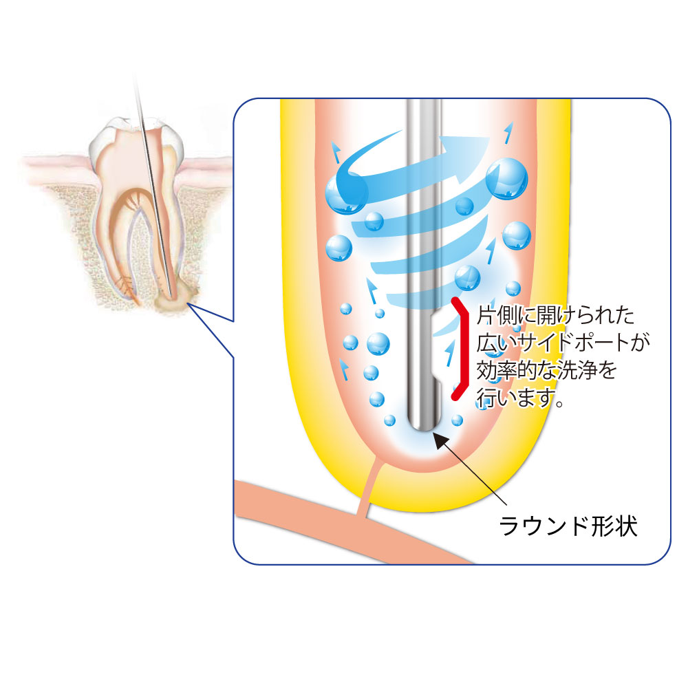 ルアーロックタイプのシリンジに接続可能。側面噴出型。先端ラウンド形状。ワイドなサイドポートから出る洗浄液は洗浄に理想的な水流を作り出すための設計がされています。洗浄液がサイドポートから分散されるため根尖部分に直接圧力がかかりません。根尖孔への物理刺激を抑えるため、根尖周辺組織の二次的炎症リスクを低減します。