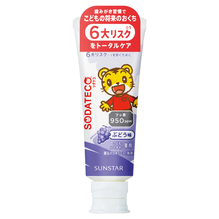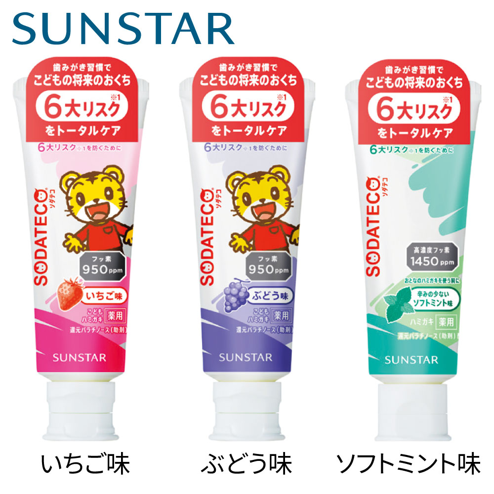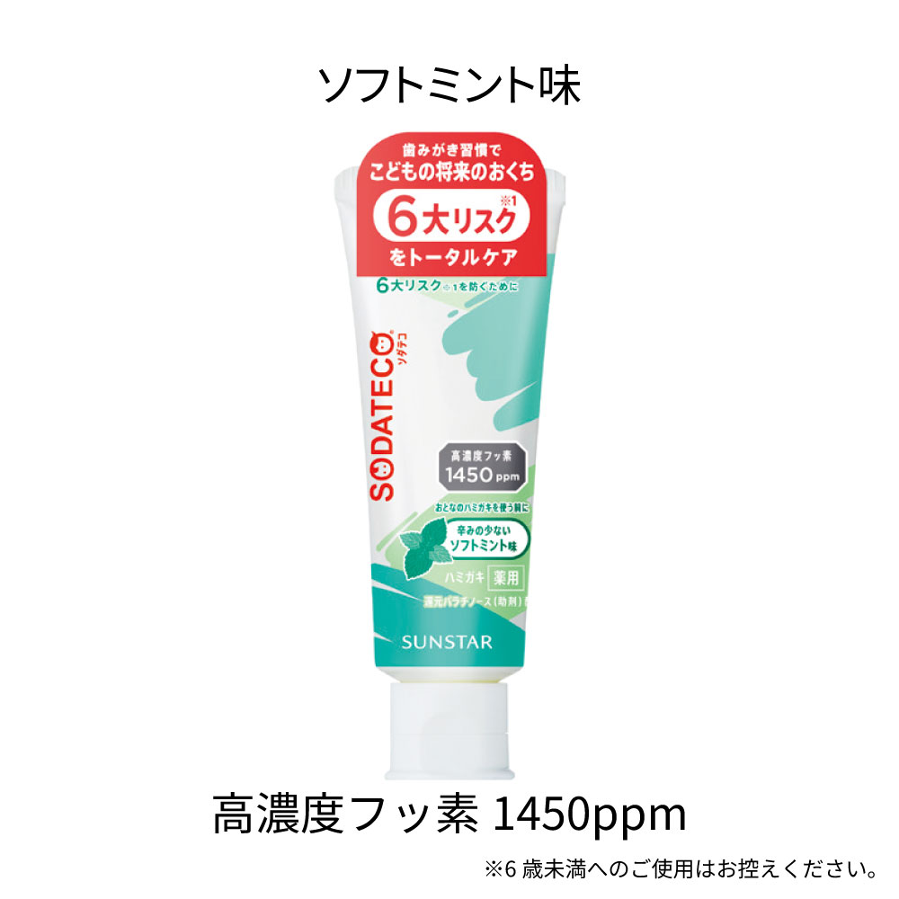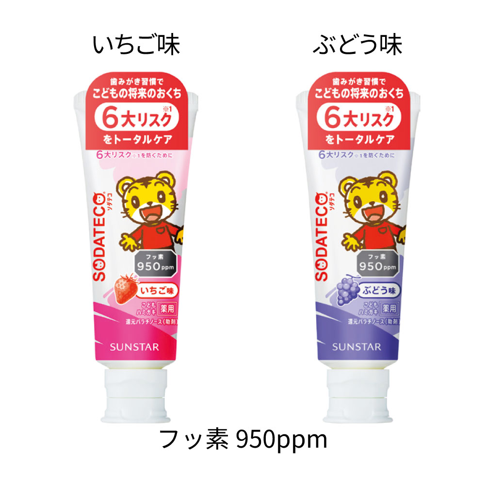 年齢に応じたフッ素量です。いちご味・ぶどう味:3才~(フッ素950ppm)、ソフトミント味:6才~(高濃度フッ素1450ppm)