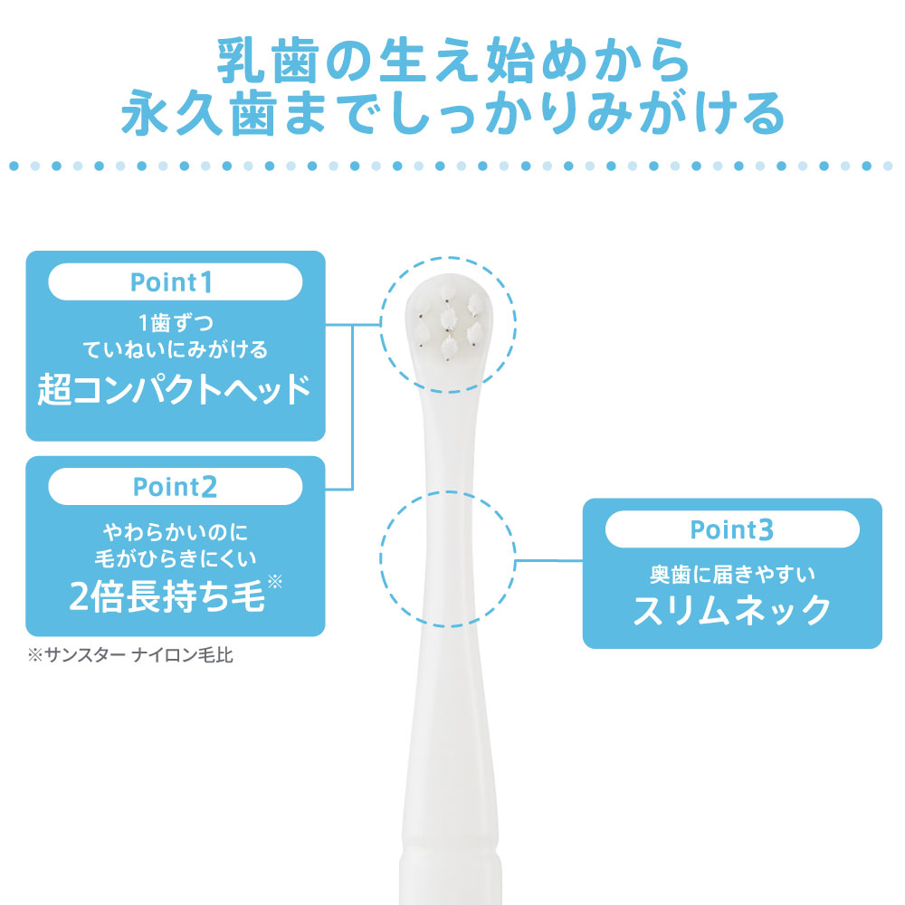 乳歯の生え始めから永久歯までしっかりみがける、超コンパクトヘッド。奥歯に届きやすいスリムネック。