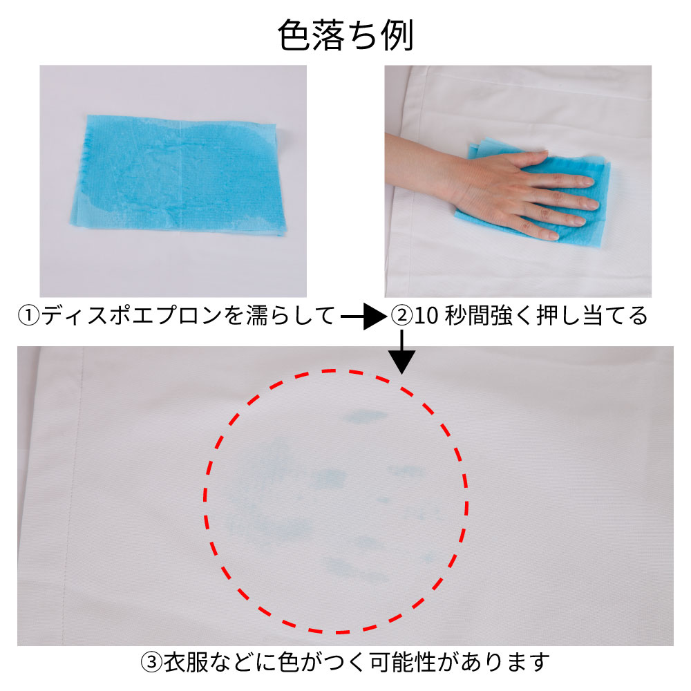 【ご注文前に必ずご確認ください】こちらのディスポエプロンは水に濡れると、色落ちする可能性があります。画像2枚目をご確認ください。本来であれば破棄する予定でしたが、中東情勢の影響によりディスポエプロンも品薄状態が続いているため販売することにいたしました。通常の診療においてディスポエプロンに大量の水がかかってしまう可能性は低いと考えておりますが、ご使用の際はご注意ください。